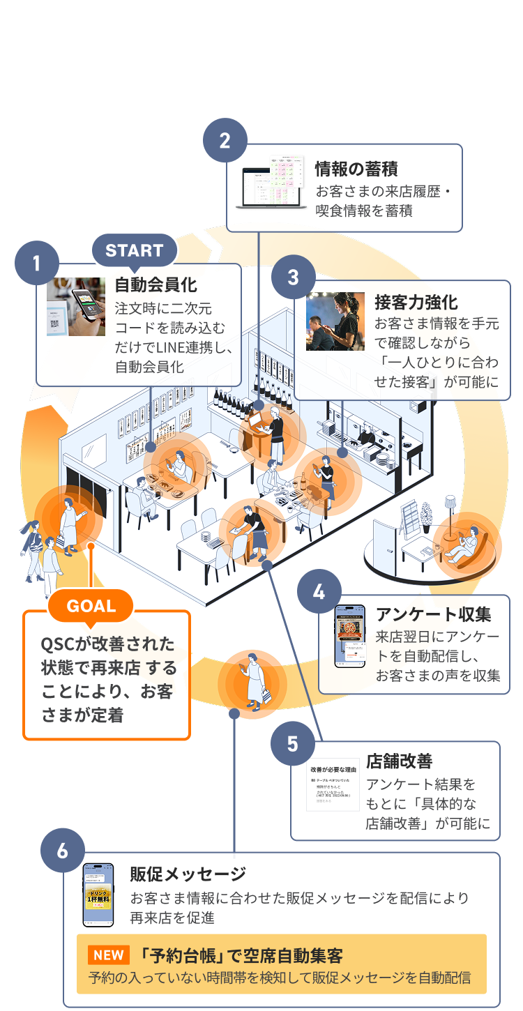 お客さまがスマホから注文する際に、LINE連携で顧客データを自動取得。来店履歴・注文履歴がハンディに表示され、新人でも「常連か初来店か」「前回何を頼んだか」が一目で分かり、ベテラン同等の接客が可能に。