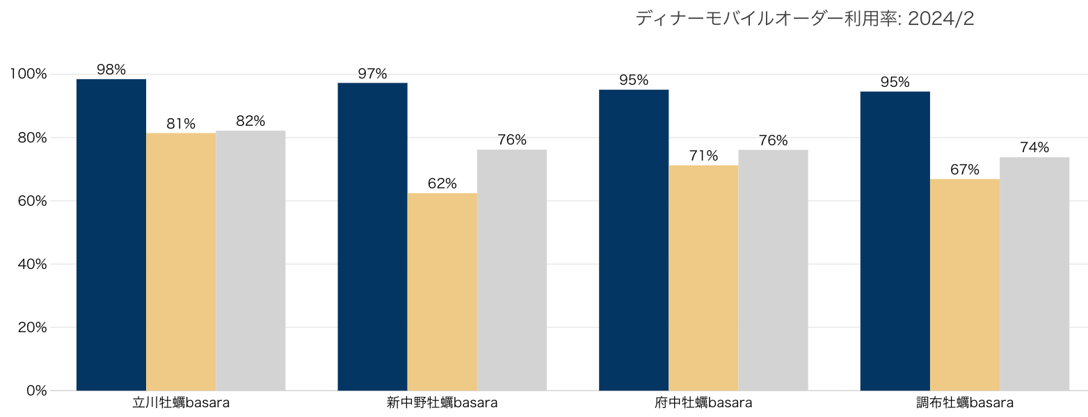 テーブルごとのモバイルオーダー利用率(紺色)と、客全体での利用率(黄色)。2023年2月は、立川店が500人、調布店が408人、府中店が270人、新中野店が338人、計1,500人以上がLINE会員化をしています。