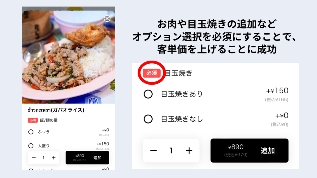 新井さま:特に効果が大きかったのは、オプション選択の必須化です。例えば、ガパオライスの目玉焼き追加のオプションを必須にしたところ、出数が10倍に増加しました。