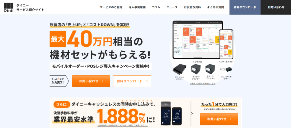 さらに、最大40万円相当の機材セットが無料でもらえる、「モバイルオーダー・POSレジ同時導入キャンペーン」を実施中です。導入コストをおさえ、売上アップも実現していきたい方、ぜひ一度お問い合わせください。