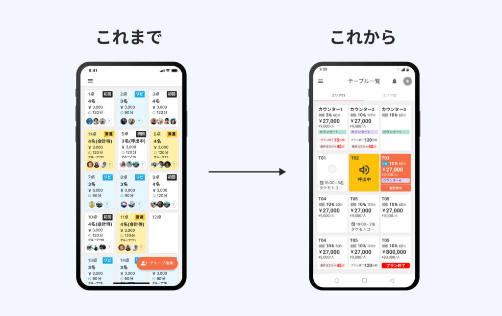 これまで初回来店や再来店と店舗への来店回数などを表示し、各テーブルの情報を一覧で確認できるデザインでした。アップデート後は、さらに各テーブルの注文状態などもひと目で把握することができる表示に変更し、接客に活用いただくことが可能となります。
