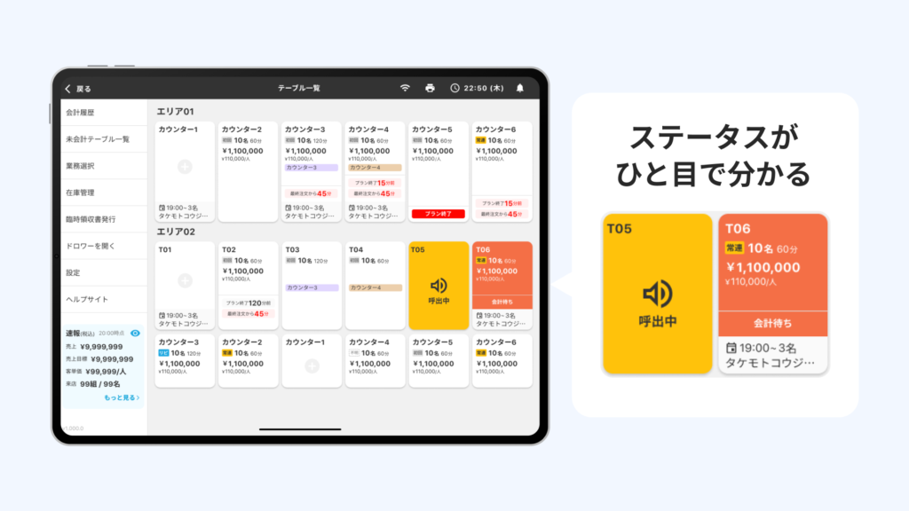 例えば、客単価の表示、入店時刻や最終注文時刻からの経過時間などをアラート通知する機能などを追加することで、スタッフがお客さまへ声かけをするきっかけを創出し、店舗の売上アップが期待できます。またテーブルからのスタッフ呼び出し、会計待ちなど、各テーブルのステータスを今まで以上に明確に表示することで、スムーズな接客対応を促進し、顧客満足度の向上にもつながります。