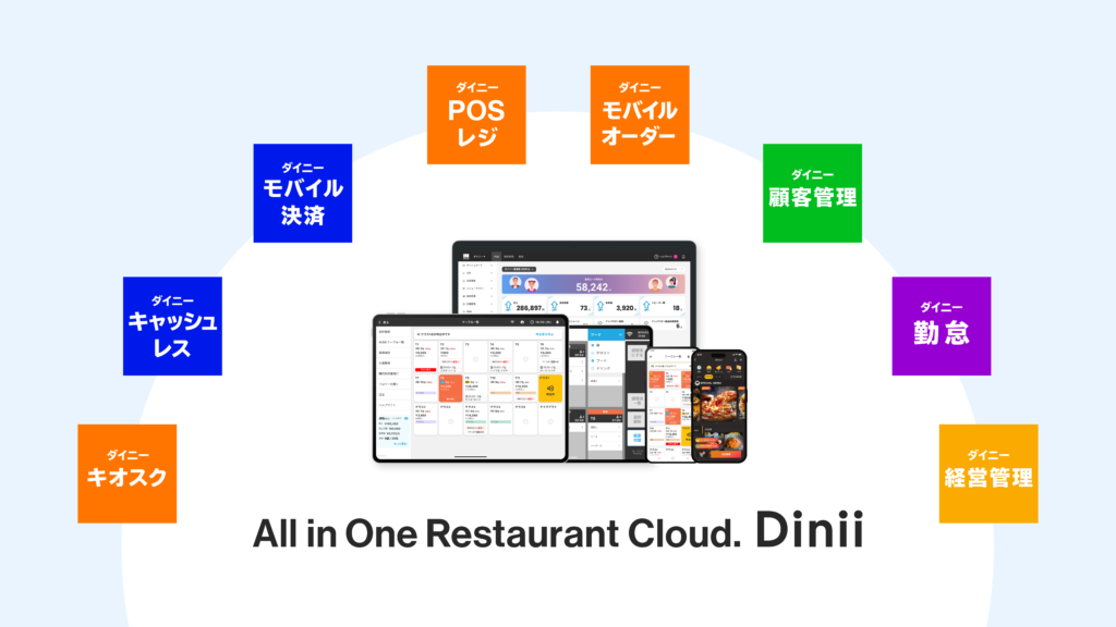 ダイニーのAll in One Restaurant Cloud.は、飲食店運営に必要な予約・顧客管理・売上分析・マーケティング・人材育成などを一元化できる、飲食店向けのクラウド型オペレーション支援システムです。店舗が抱えるあらゆる課題を「一つのプラットフォーム」で解決し、現場が主役のデジタル化”を実現しています。