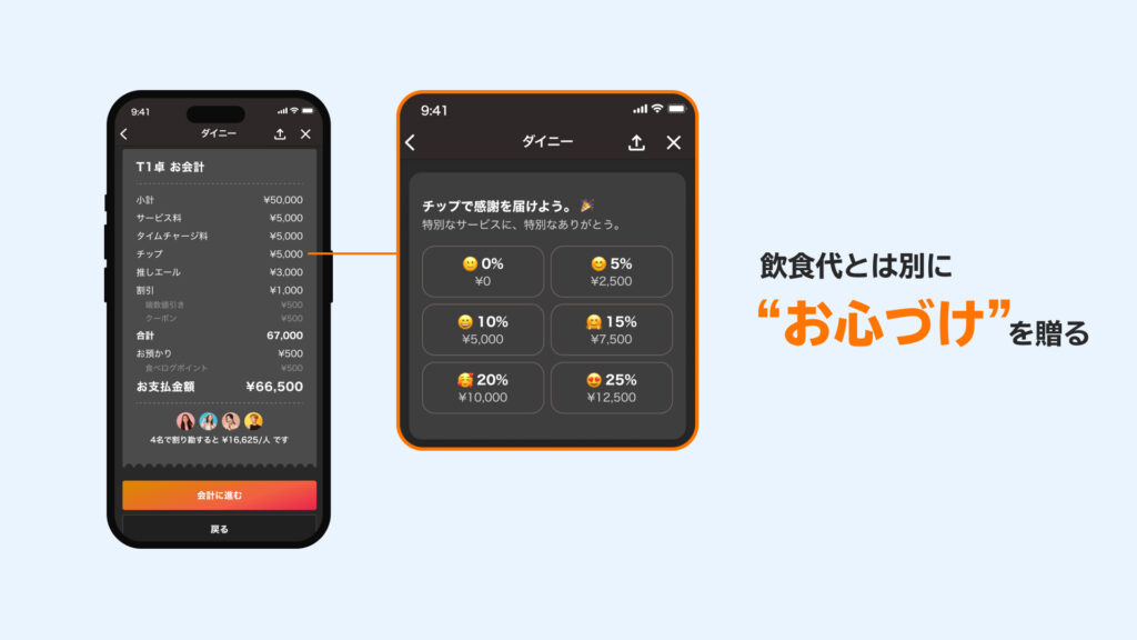 ※1「業界初!飲食店でモバイルオーダー上から贈る「チップ」提供開始」(2025年6月2日プレスリリース https://prtimes.jp/main/html/rd/p/000000091.000043056.html)