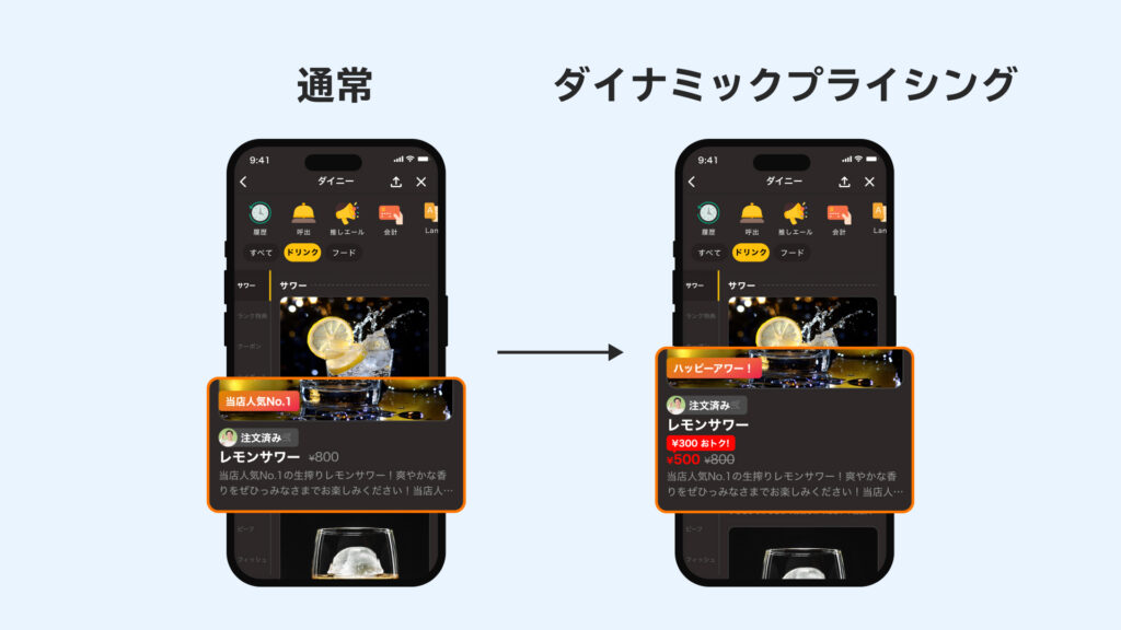 2025年9月8日(月)に、時間帯や曜日など時間情報をもとにメニュー価格を自動に変更することができる「ダイナミックプライシング」機能をリリースしました。追加収益が難しいという飲食店は、繁忙期は価格を上げることで収益を最大化し、閑散時は価格を下げて集客を促進することで、効率的に売上をアップすることを実現できます。また消費者にとっても、混雑を避けるとお得に外食することができる“新しい選択肢”のひとつとなります。