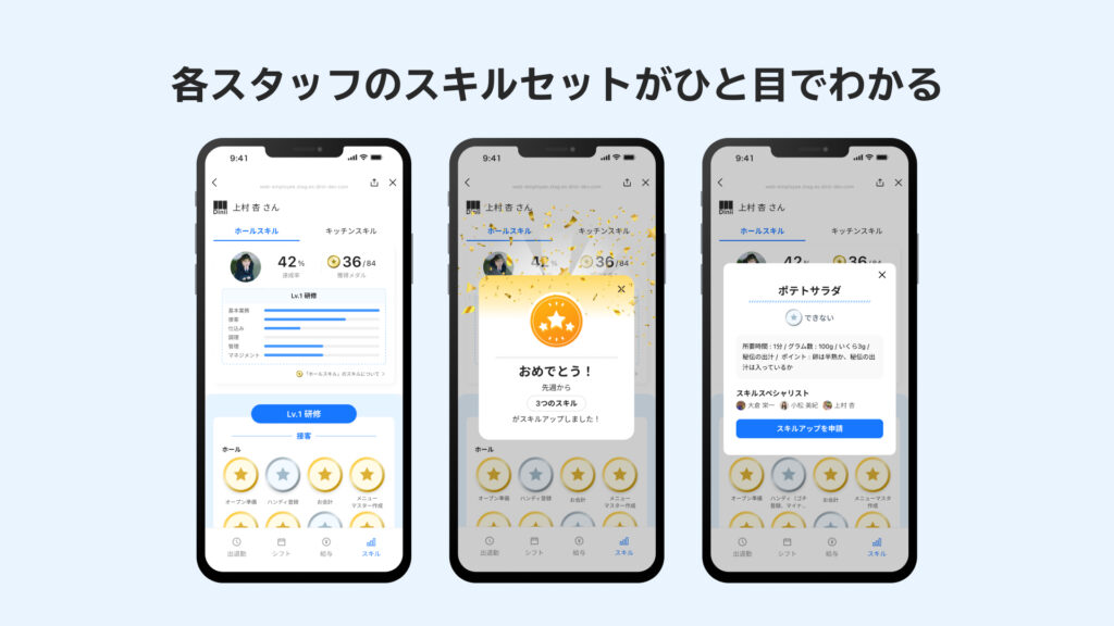 スタッフの自律的な成長と定量的な評価を支援することができる「スキル管理」機能をリリースしました。スタッフは自身の成長目標と進捗をいつでも把握することができるため、成長と待遇向上のスピードが上がります。また飲食店経営者や店舗管理者は、スタッフのスキル習得状況を定量的に分析・管理することができ、数値に基づいた適切な評価を行えるようになりました。