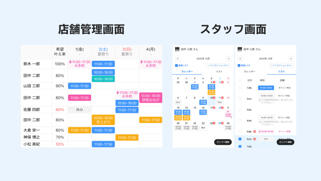 複数店舗を運営する飲食店が、店舗間でシフト状況に応じて別店舗のスタッフをヘルプすることができる機能をリリースしました。誰がどこで働いているか・追加で働ける余力のあるスタッフが誰かシフト表1ページで調整可能になります。またヘルプ後の煩雑な給与や交通費の計算は店舗ごとに自動で集計しますので、大幅に作業効率が改善します。急なシフト変更や人材不足店舗へのヘルプ募集を円滑化することができ、全店舗の効率的な人材配置とサービス品質の維持に貢献します。