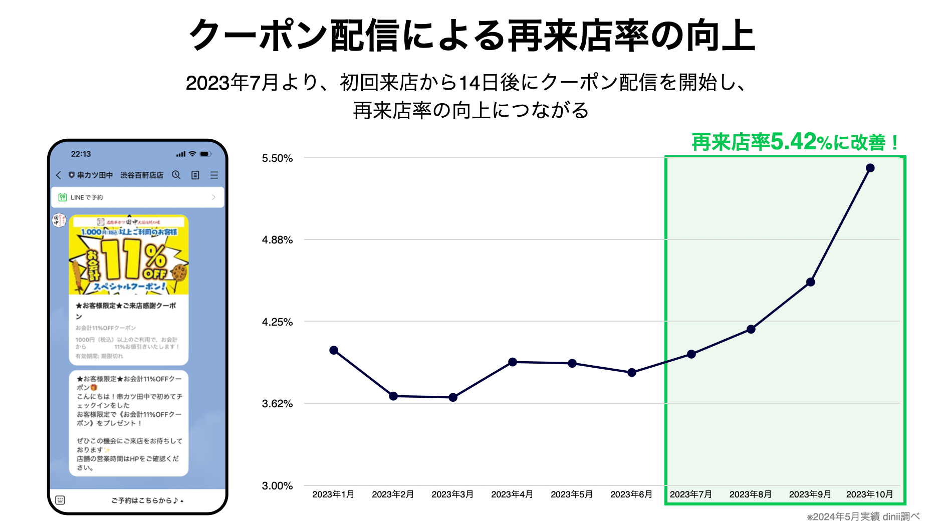 お客様の来店・喫食情報に合わせて効率よくメッセージ配信ができるダイニーの特徴を活かし、「初回来店の14日後にクーポンを自動配信」設定をしたところ、2回目の再来店率が5.42%に上がりました。