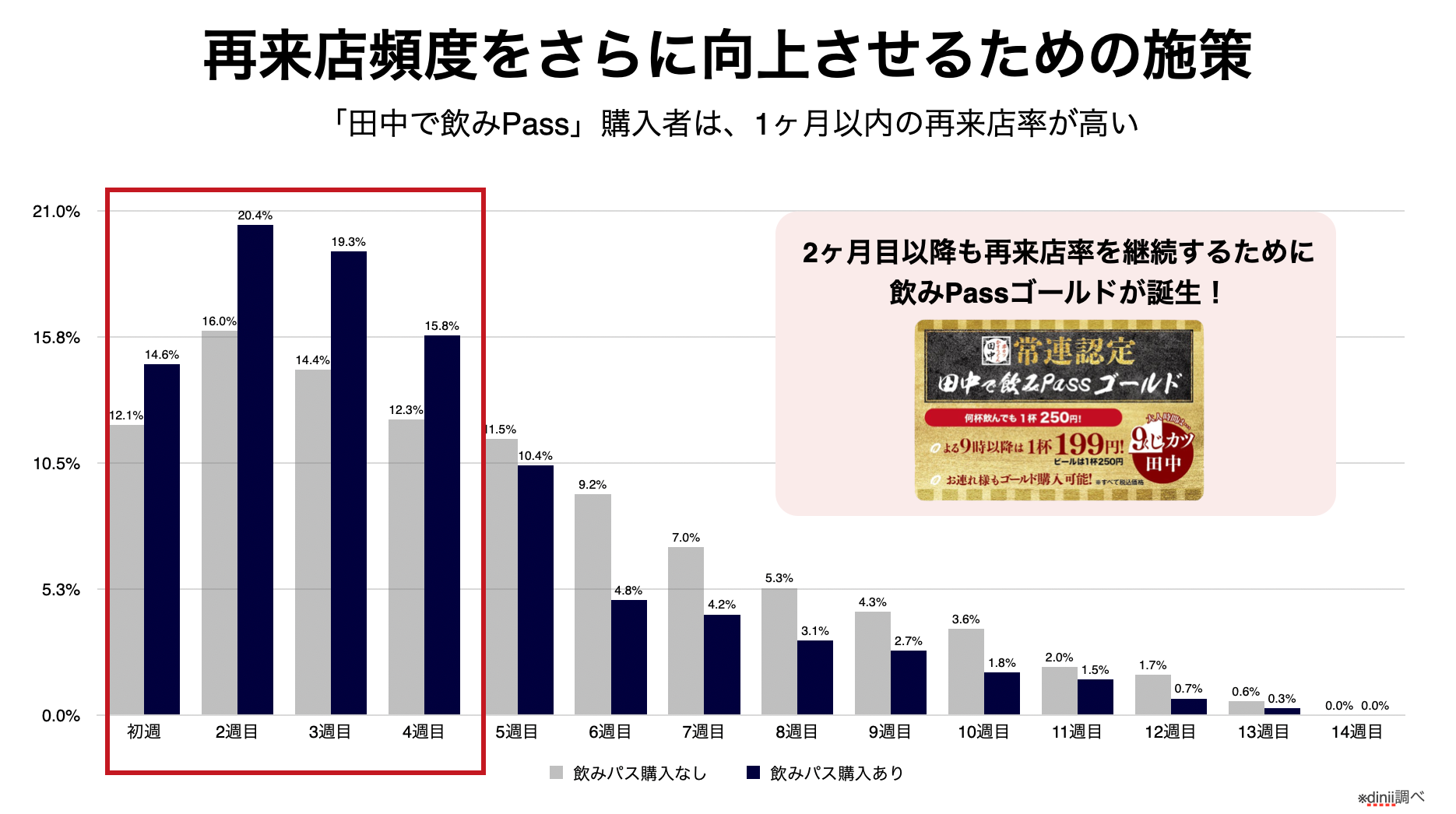 • 「田中で飲みPass」により再来店の早期化、総来店回数の増加に成功