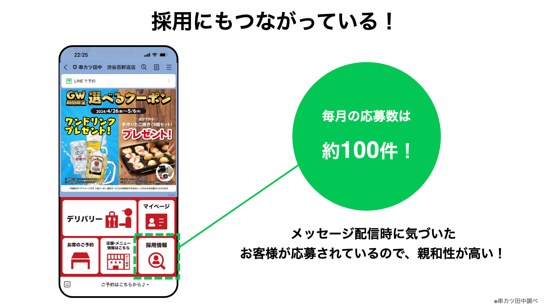 • LINE公式アカウントのアルバイト応募導線により毎月100件の応募あり